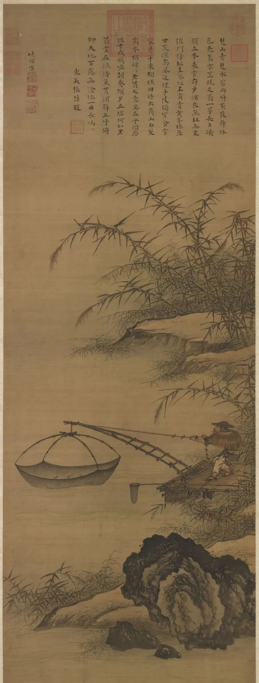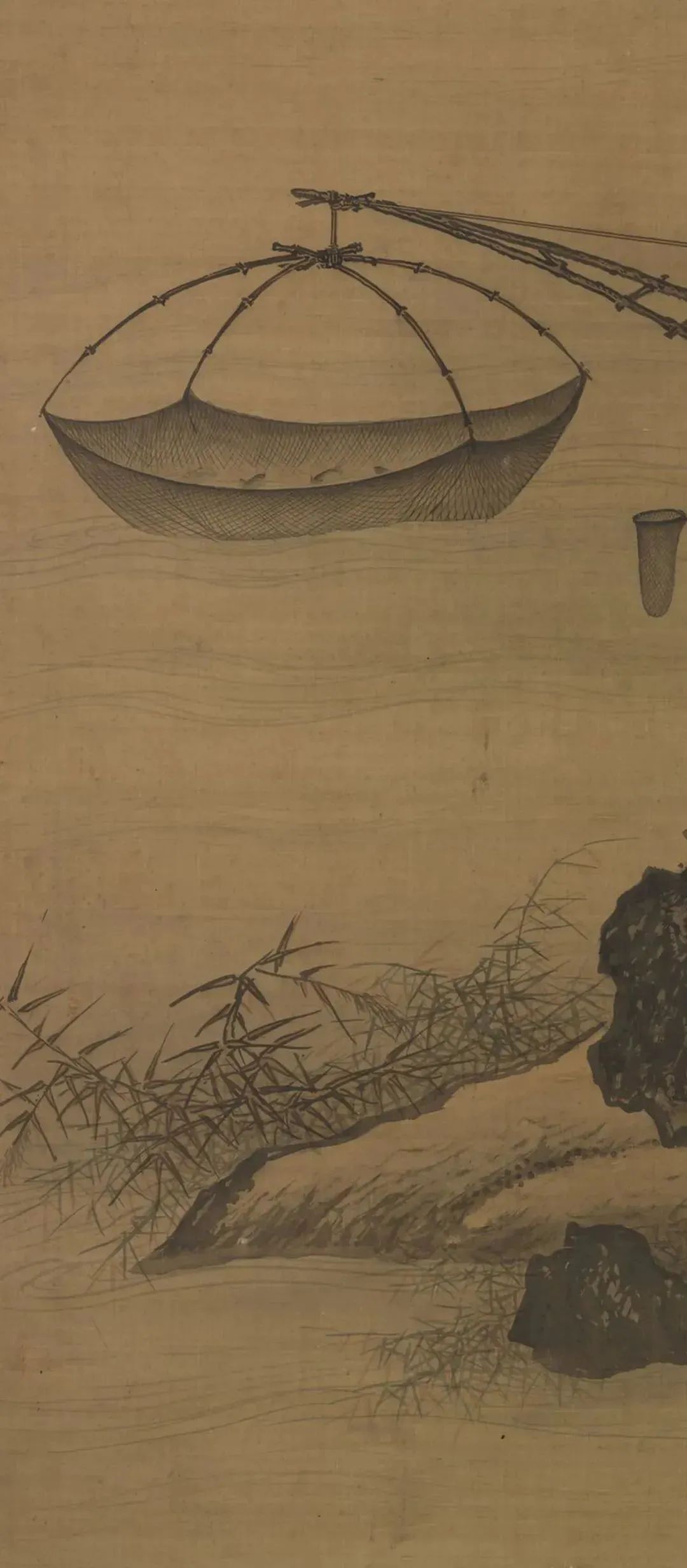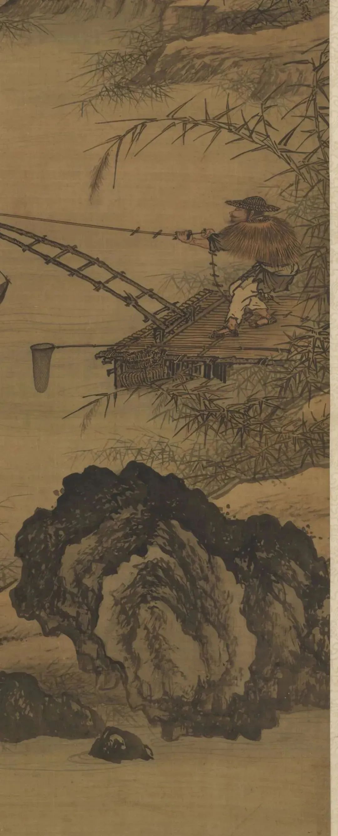 首先,从构图上来看,《捕鱼图》展现了一种精巧而和谐的布局。画面近景是河岸,巨石与小石错落有致,芦苇和杂草随风摇曳,营造出一种自然野趣。中景则是画面的核心,一位渔翁身着蓑衣,头戴斗笠,正专注地张网捕鱼,他的身影与周围的自然环境融为一体,显得那么自然、那么真实。远景则是芦塘与河岸的延伸,芦获丛生,苇叶茂繁,为画面增添了一种深远和辽阔的感觉。这种由近及远、层次分明的构图方式,使得画面既具有立体感,又富有节奏感。